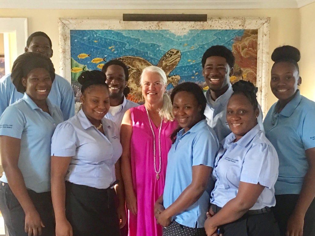 There’s Jen (the magician who runs the place.) I can hear her laugh now.Krishna. Our beautiful, young chef. She should own the place. Her food? Why outsiders flock to Runaway like sparrows. “Best on the island!” Krishna. Jen? Sign her to a long term contract. Please.Then there’s Tammy, Oisha, Princess and Leslie … who treat us like royalty at every meal. Tyrez … my early morning buddy. Rashad … his smile? Every dinner’s appetizer. Giovanni and Jarrett … Bombas, Pinot Coladas, Gin (Hic! thanks guys!) … personalities, fun unmatched. Jonas … I call him “bulldog” … there isn’t anything he can’t fix … Oh, other than our shower this visit. Finally stumped him! Ben … the guy raking the beach at 5:30am each new day. The beautiful ladies more behind the scenes … straightening our room, in the kitchen. Gardening. All of them. On and on.Fellow guests we’ve met over the years. This time? Shelley and Raya … Gar and Weissy … the guy and his wife from Boston (memory thing again) … Camille (never forget Camille) and Peter … Gary and Pat. Buck and Kelly … who lodged elsewhere, but “